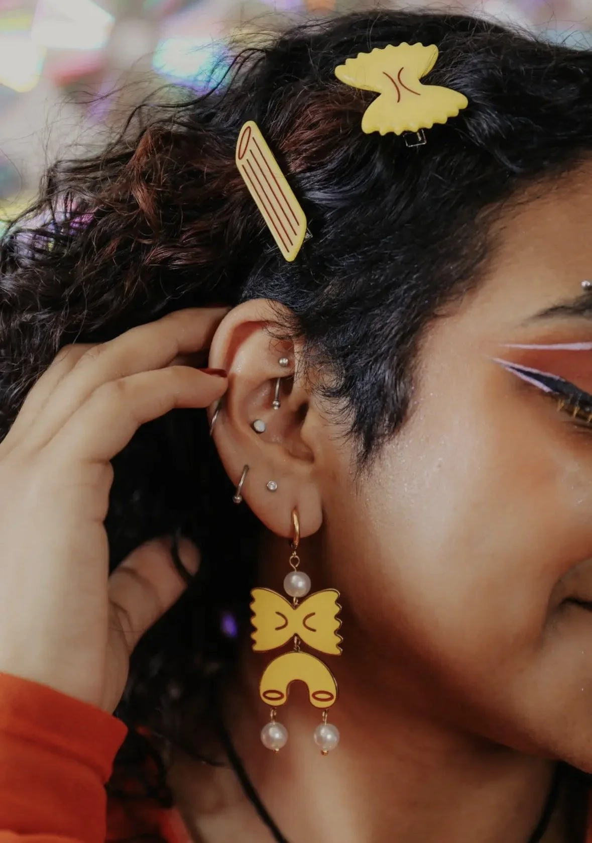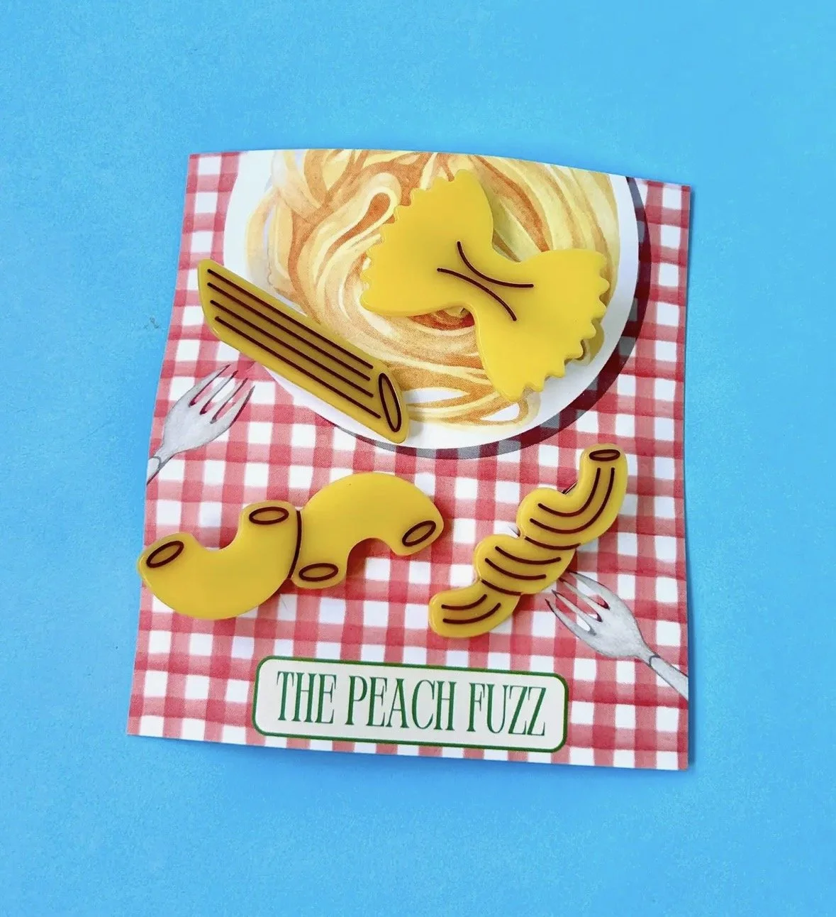 Shop › Pasta noodle hair clip set Image 1 of 4 Image 2 of 4 Image 3 of 4 Image 4 of 4 Pasta noodle hair clip set $25.00 By the peach fuzz. Set of 4 clips. Add To Cart Added! By the peach fuzz. Set of 4 clips.